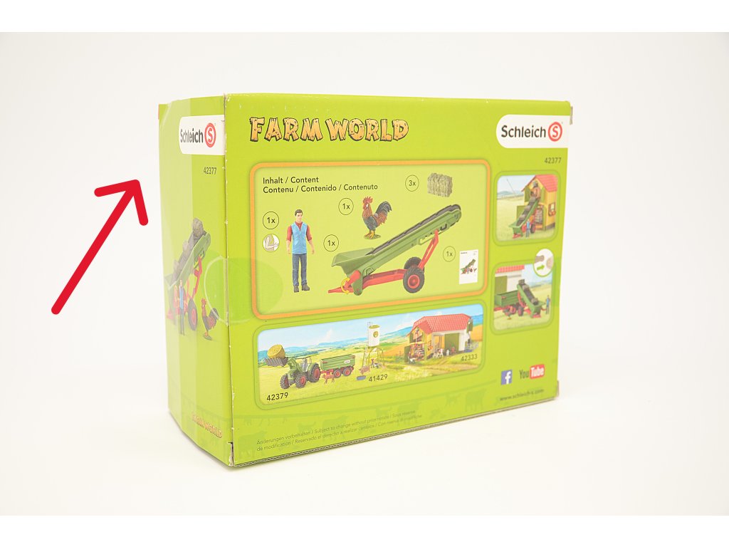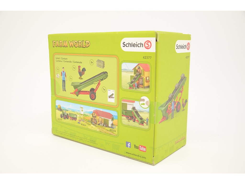 Dopravník na seno zn,. Schleich byl vzorován v roce 2016 a je NOVINKOU ROKU 2017. Stroj se pohání točením za kliku. Souprava obshuje farmáře, dopravník, kohout a balík slámy. Hračka pro děti o 3 let.