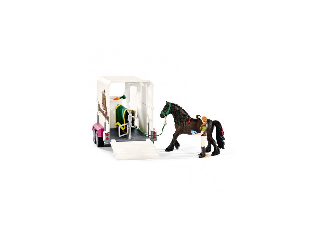 Tento detailní model s mnoha pečlivě vytvořenými prvky má odnímatelnou střechu, v přívěsu je prostor pro 2 koně, pro sedlo, uzdu, krmivo a pitnou vodu. Obsahuje všechno zobrazené příslušenství včetně koně, dvou osob a samolepek pro vyzdobení přívěsu. Rozměr: 51,5 x 14,5 x 12,5 cm. Rozměr balení: 39 x 23 x 16,5 cm. Nevhodné pro děti do 3 let. Doporučený věk: 5-12